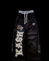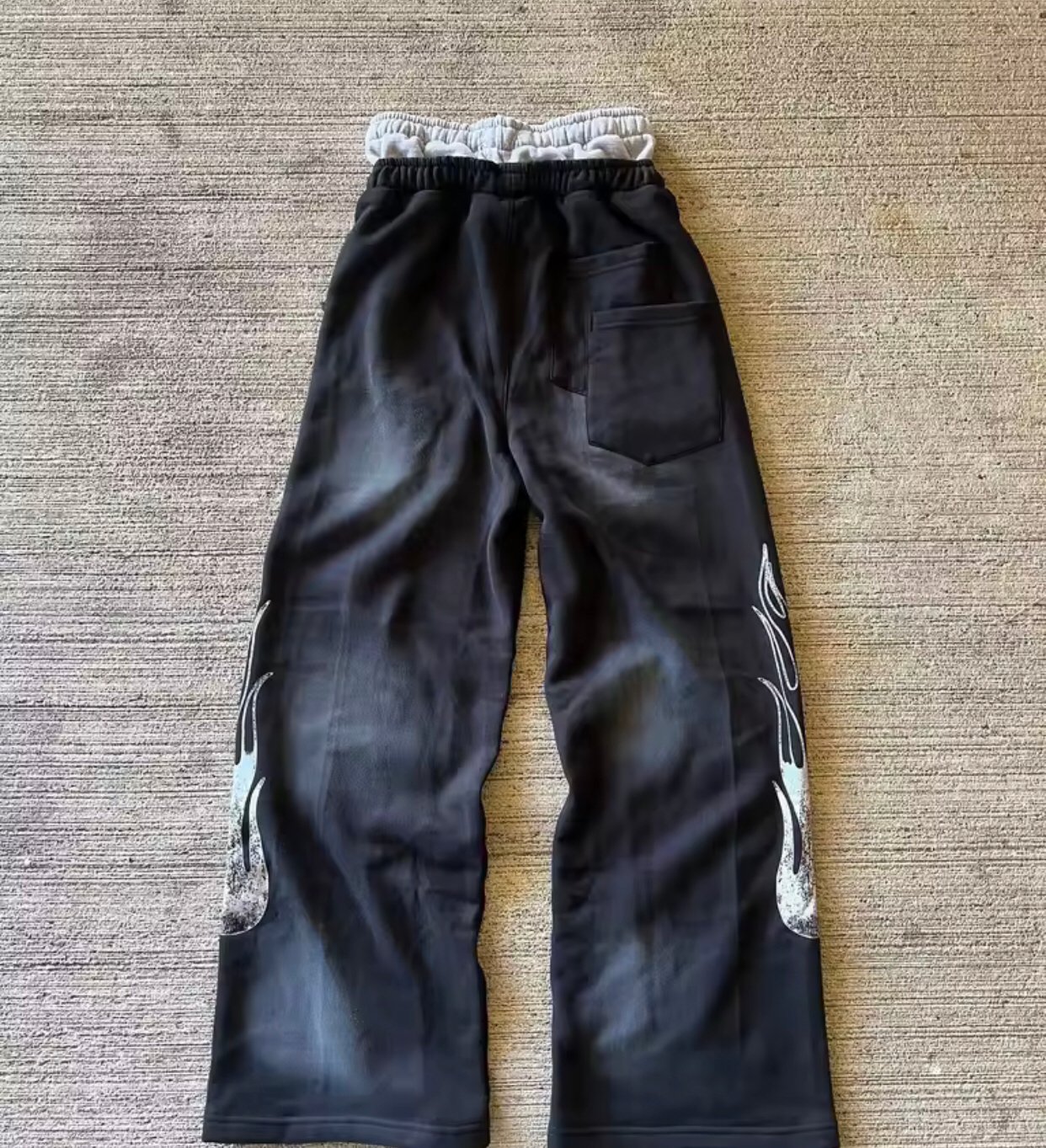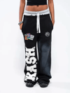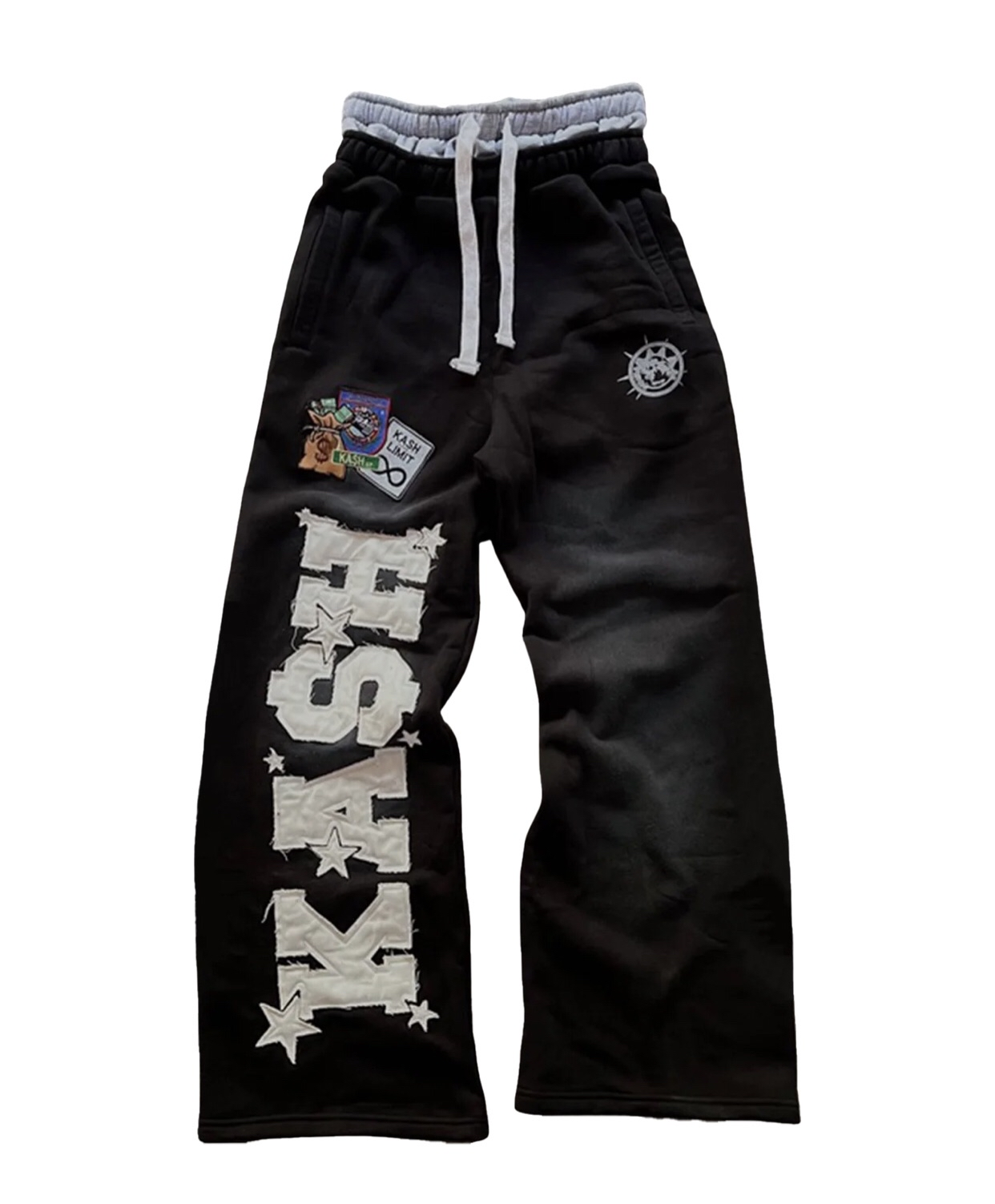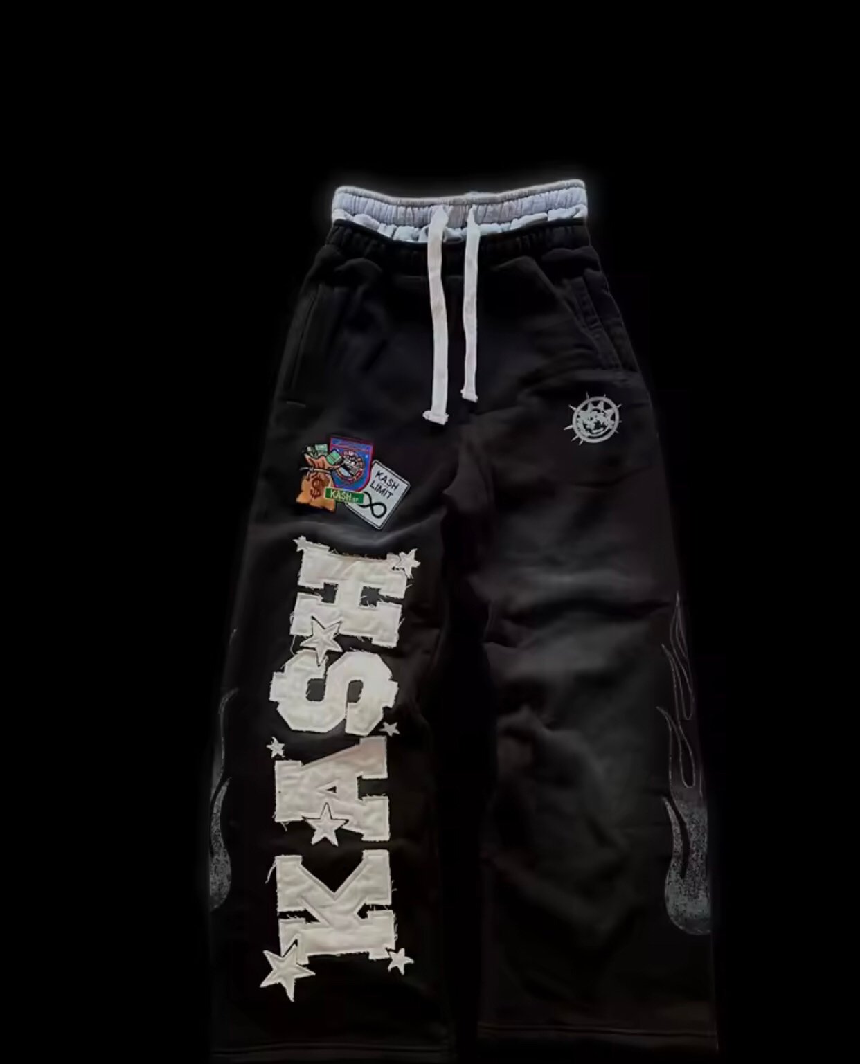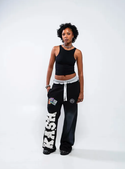 Step up your streetwear game with these bold and edgy KASH sweatpants. Made from soft, breathable fabric with a relaxed fit, these black joggers feature standout graffiti-style graphics, including a large "KASH" print down the left leg, colorful patchwork on the right thigh, and striking white flame designs down the sides. The adjustable drawstring waistband and elastic cuffs provide ultimate comfort and style—perfect for everyday wear, lounging, or making a statement out on the streets.